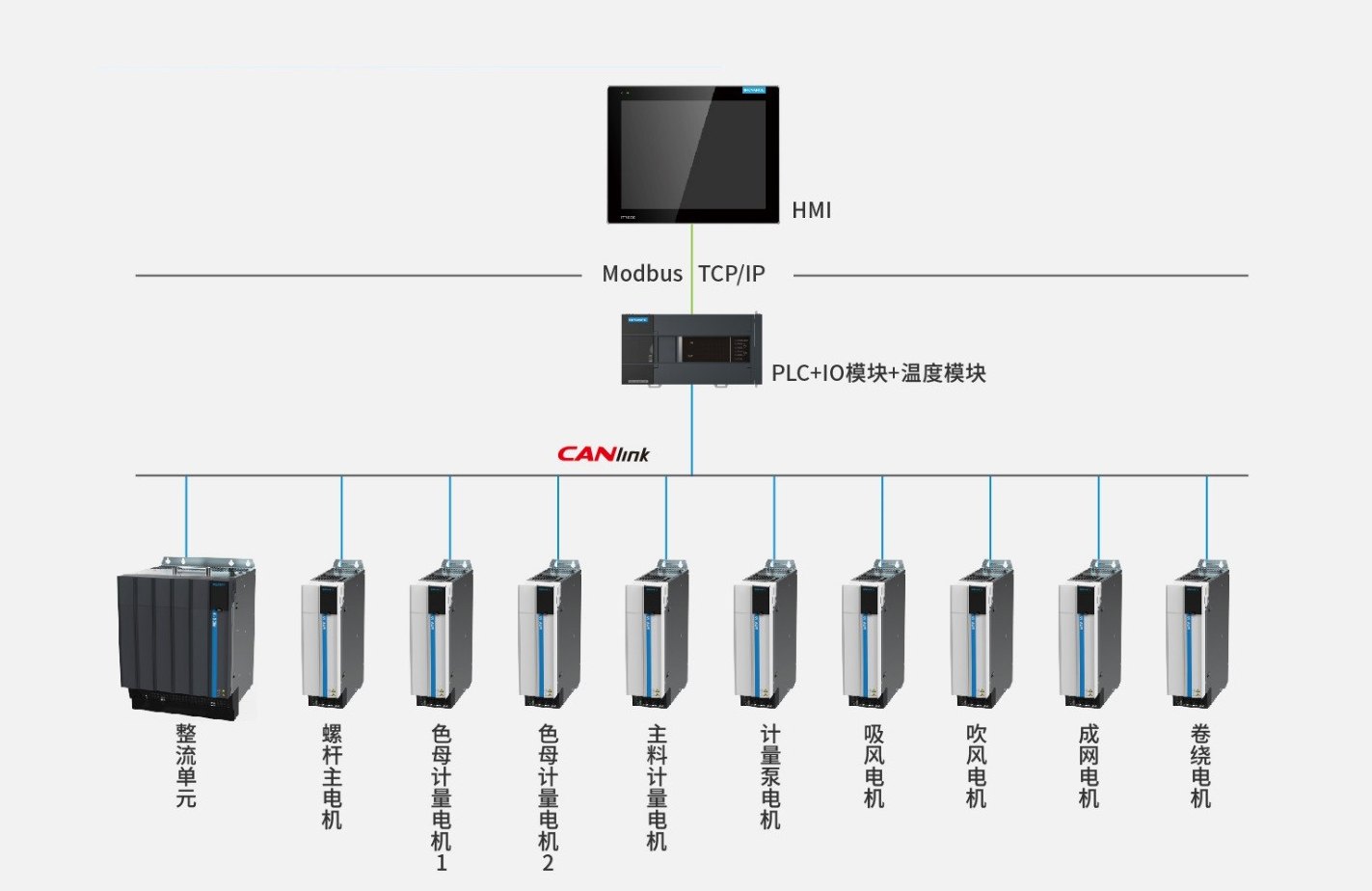 熔噴線系統解決方案采用H3U+MD810的方案,采用CAN總線來連接。系統整體解決方案提高現場的設備的穩定性,抗干擾性更強。同時,變頻器采用矢量控制,低頻出力大。集成專業PID,風壓控制更穩定。專用張力控制系統算法,收卷控制更穩定,張力波動1%。